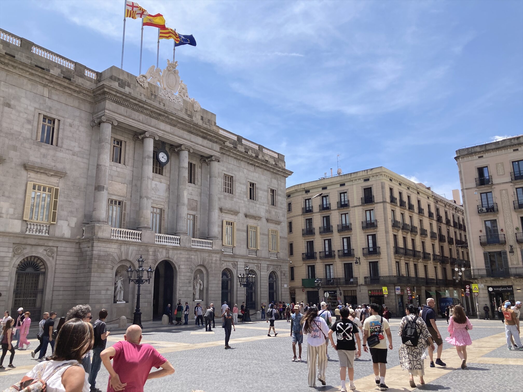 で、そんなことより、先ほどからおじさんが広場の中心で何やら声高に演説らしきものをぶっているのです、延々と。カタルーニャ語らしきその内容はわかりませんが、その口調は確かに何かを訴え、主張している様子で、そもそもこの広場はいまもカタルーニャの自治政府庁や市庁舎といった行政機関・施設があるところで、いずれも中世からの建物を現役で使っており、ていうかその中世の時分にも自治や議会のための建物だったし、しかもローマ時代の政治の中心エリア(フォーラム)でもあったということで、つまりは古代から現代までずっと、具体的にも象徴的にもそういう界隈なんだなということがわかるのです。だからこそ、いいぞおじさん、もっとやれ、やるべきだ、と思います、いつのまにかいなくなってたけど。